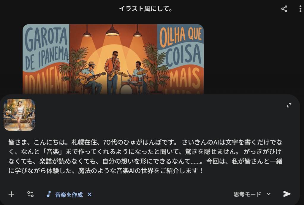 2. 画像で伝える: 写真やイラストをGeminiにアップロードして、曲の「種」を作ってもらいます。